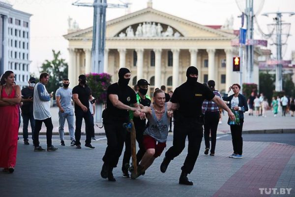 Lundi 10 août, 8h30 – La police anti-émeute OMON a été déployée en grand nombre pour disperser les manifestants pacifiques qui sont descendus dimanche soir dans les rues de Minsk, pour exprimer leur indignation face aux résultats du scrutin qu’ils estiment truqués. Les forces de police ont fait usage de gaz lacrymogènes, de coups de matraque, de tirs de balles en caoutchouc, de canons à eau et de grenades assourdissantes. Après minuit, la candidate Svetlana Tikhanovskaya, privée de l’internet dans son QG, a lancé un appel pour que la police cesse les violences. (Source : Belsat)