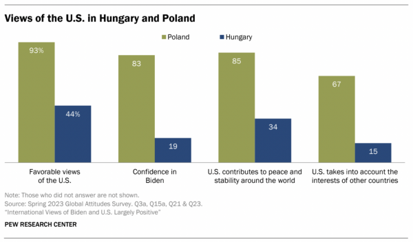 A l’opposé, seuls 44 % des Hongrois ont une opinion positive des États-Unis, 19 % ont confiance dans Joe Biden, 34 % estiment que les USA sont un facteur de paix dans le monde et 15 % pensent qu’ils prennent en compte les intérêts des autres pays.