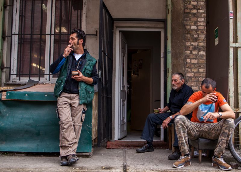 Un orage passe. Le tonnerre gronde. A l’abri d’un auvent, Attila et ses compagnons couturiers fument une clope, en silence. Première pause de la journée. Il leur reste 4 heures à tirer.