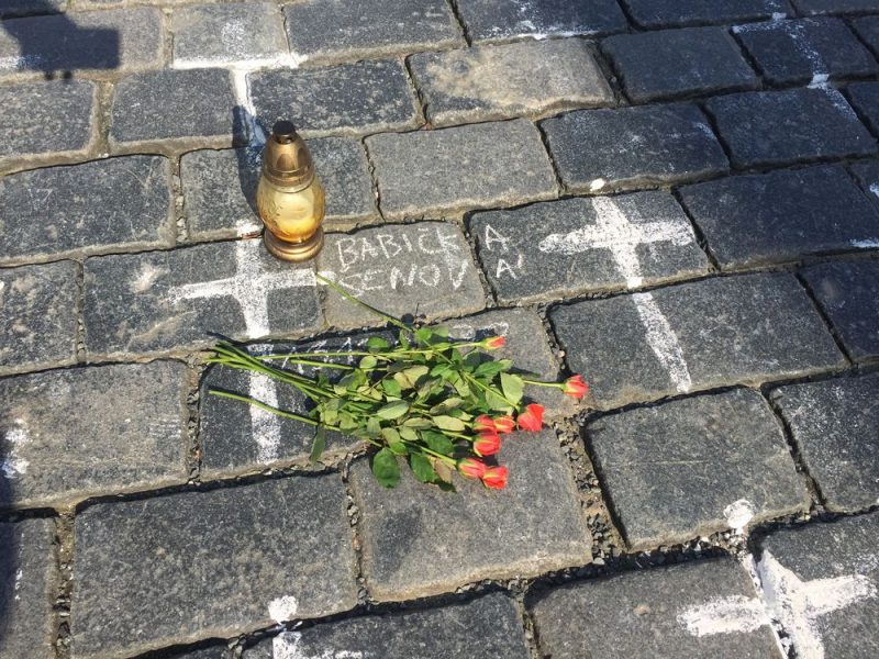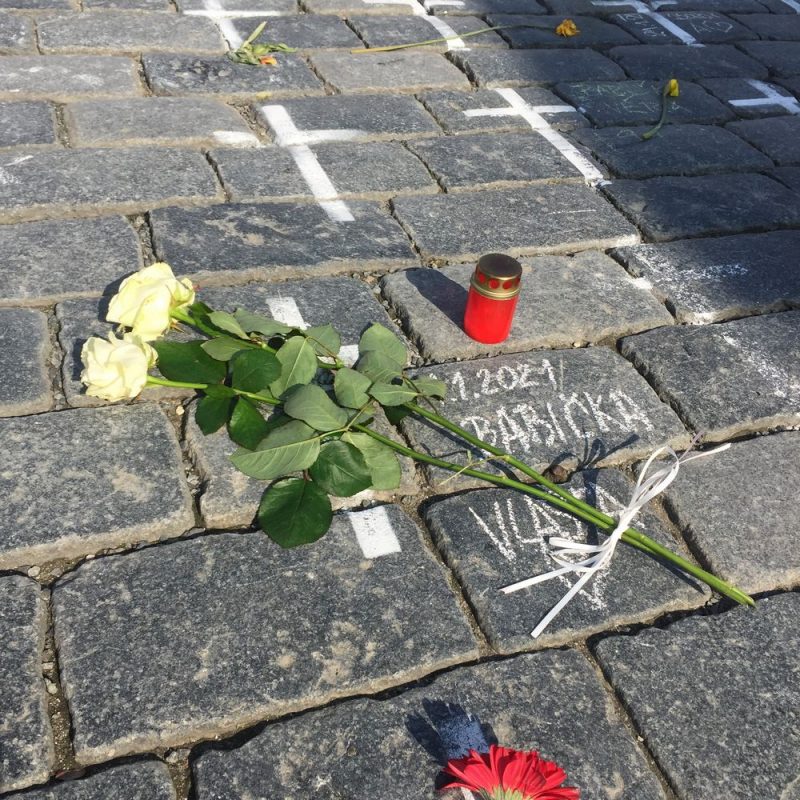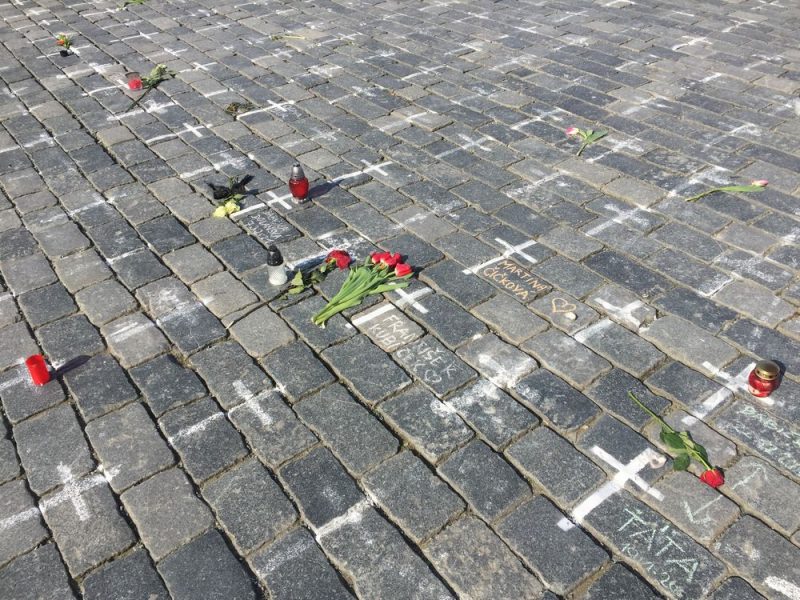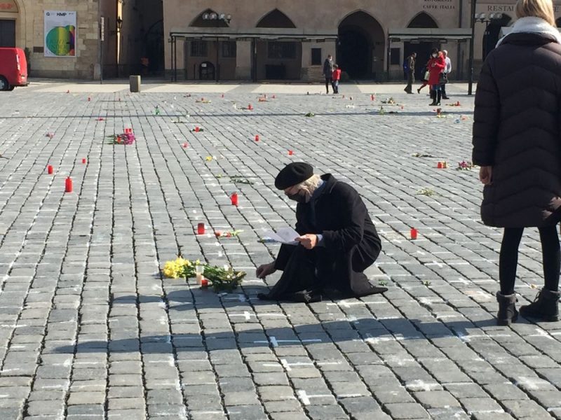 Une grand-mère invite ses petits-enfants à prier près de la Colonne de la Vierge au milieu de la place. Un vieil homme écrit à la craie le nom d’un parent et laisse des fleurs et une bougie sur les pavés. D’autres se recueillent au-dessus d’une autre de ces petites croix. Le sol est jonché de bougies et de fleurs. “Tante Marcela”, “Grand-mère 9.12.20”, “Mon frère Franta”, peut on lire sur les pavés ça et là. Plus loin, “Grand-mère” et “Papa” sont liés par deux flèches, marquant le double deuil d’une famille.