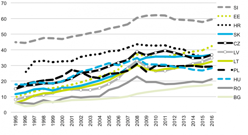 Le syndicat réagissait ainsi à une récente étude de l’économiste hongrois Béla Galgóczi, chercheur à European Trade Union Institute (ETUI). [2]Why central and eastern Europe needs a pay rise – Béla Galgóczi, European Trade Union Institute (ETUI). Cette étude montre que la crise financière et économique a porté un coup d’arrêt brutal au processus de convergence salariale des pays de l’ancien bloc de l’est qui ont rejoint l’Union européenne à partir de 2004.