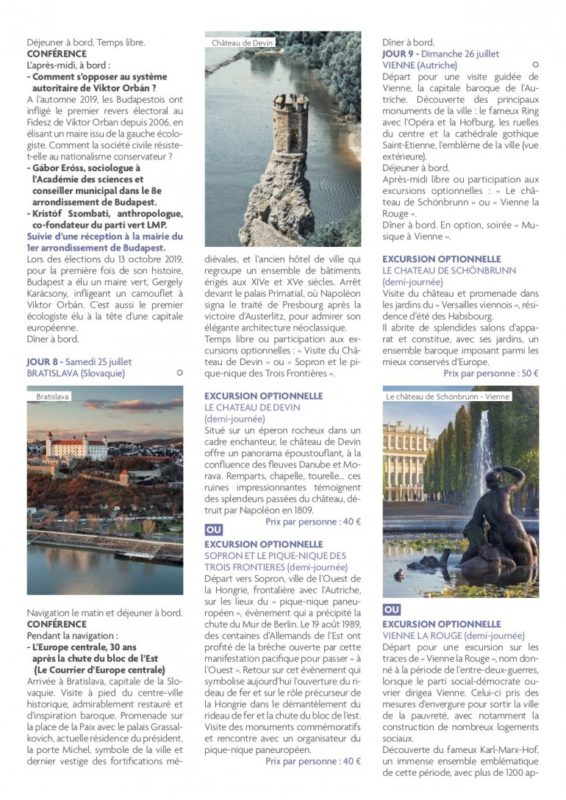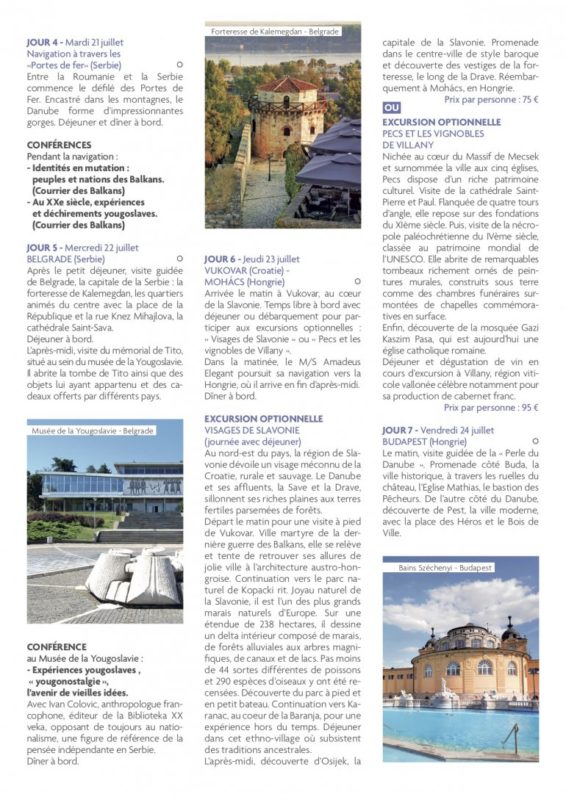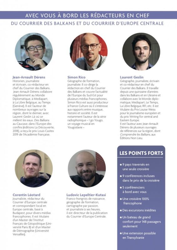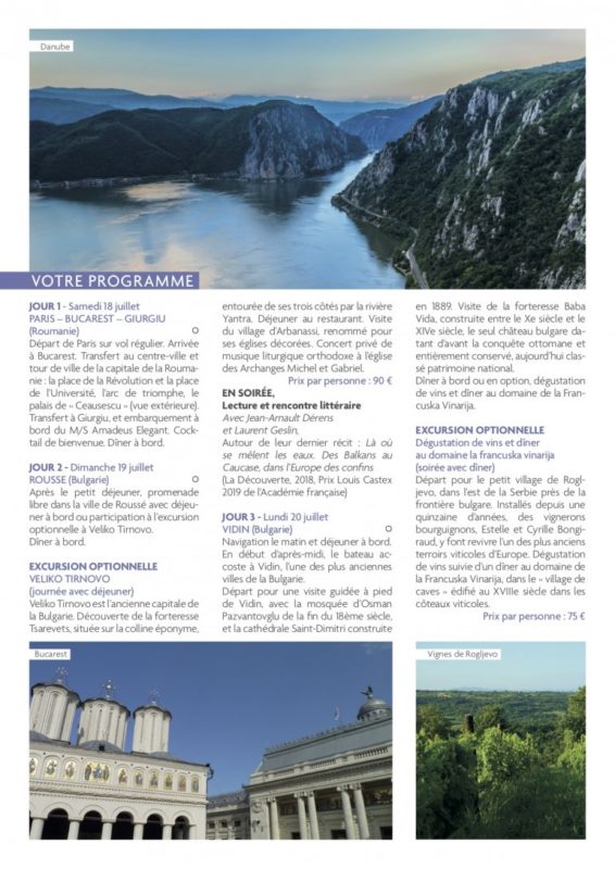 - Accompagnés par les meilleures spécialistes francophones des Balkans et de l’Europe centrale, cette croisière exceptionnelle alliera culture, patrimoine, découverte et géopolitique. Au rythme lent de la navigation fluviale, les paysages prendront la parole pour raconter l’histoire des hommes et des femmes qui ont vécu et qui vivent sur les rives du fleuve.