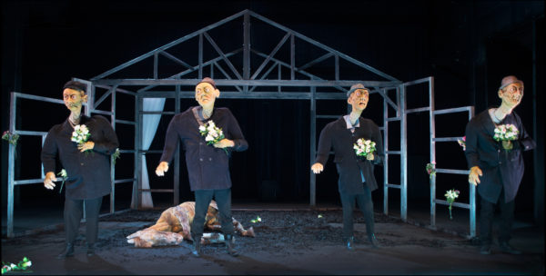 Sur un tapis de feuilles mortes, une silhouette encapuchonnée avance à pas feutrés. Elle s’approche lentement de ce que le public devine être un amas de chair, une poupée dénudée, abîmée. En quelques mouvements de poignet, une marionnette enfantine, sans vêtements ni cheveux, vient s’animer et nous présente son regard exorbité. Sans fard ni artifice, des corps dépouillés prennent vie, des voix toutes droit venues des forêts et des campagnes d’Ukraine et de Biélorussie, portées par les acteurs et marionnettistes de la Compagnie Point Zéro, viennent nous raconter leur vie de « gens d’après », d’habitants de l’inhabitable.