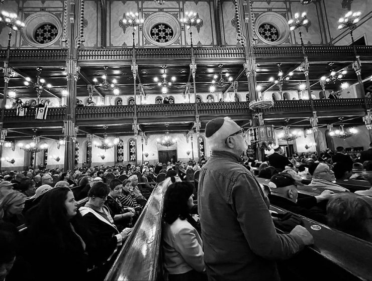 Plusieurs centaines de personnes se sont rassemblées dans et devant la grande Synagogue, au cœur de la capitale hongroise, pour afficher leur soutien à Israël . . .