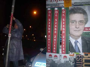 Les badauds d’Erzsébetváros connaissent sans doute le visage et le nom du Dr. Zoltan Szabo, candidat MSzP aux législatives, dont on retrouve les affiches placardées dans le quartier. Ce que les passants ignorent peut-être, c’est que le candidat lui-même colle certaines de ses affiches, notamment celles disposées sur les supports les plus curieux (voir photo).